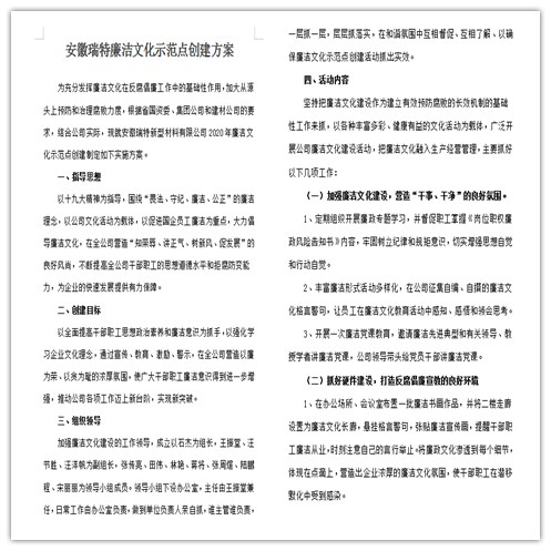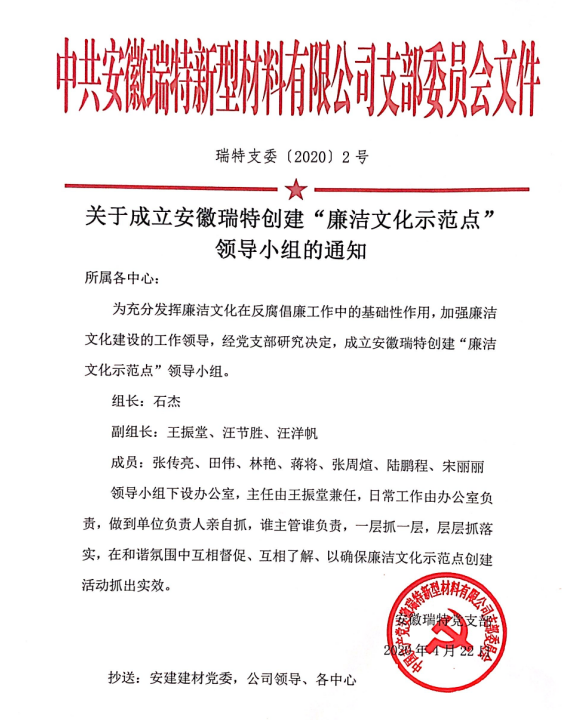 為進一步規(guī)范生產(chǎn)經(jīng)營管理,強化廉潔意識,充分發(fā)揮企業(yè)文化在公司發(fā)展中的引領(lǐng)作用。安徽瑞特依據(jù)2020年度目標任務(wù),結(jié)合生產(chǎn)經(jīng)營特點,自今年4月中旬以來,扎實開展了 “廉潔文化示范點”創(chuàng)建工作。