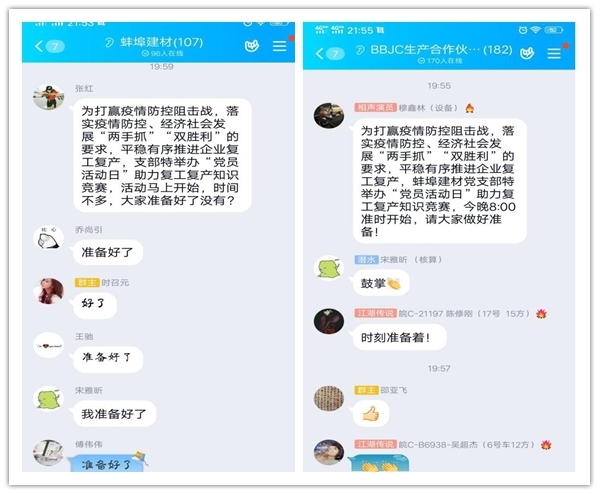 `活動于3月13日晚上7點(diǎn)30分,率先以小規(guī)模答題模式在蚌埠建材團(tuán)支部QQ群(33人)進(jìn)行;并于晚上8點(diǎn)整,同時在蚌埠建材黨員之家QQ群(25人)、蚌埠建材QQ群(107人)、BBJC生產(chǎn)合作伙伴QQ群(182人),進(jìn)行全面開花式線上搶答活動。