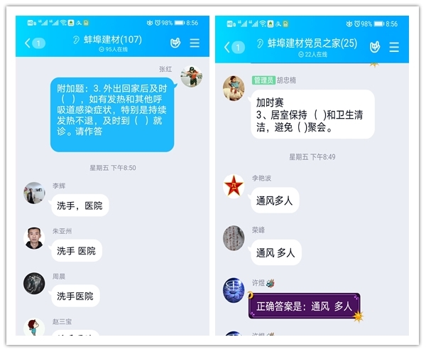 針對當(dāng)前疫情防控形勢,蚌埠建材黨支部發(fā)揮“互聯(lián)網(wǎng)+”優(yōu)勢,通過在搶答題中融入新冠肺炎防疫知識、企業(yè)復(fù)工復(fù)產(chǎn)安全知識等熱點(diǎn)內(nèi)容,趣味簡介的答題方式贏得公司廣大職工熱情參與,使防疫知識深入人心,助力公司有效應(yīng)對疫情、穩(wěn)定生產(chǎn)經(jīng)營、實(shí)現(xiàn)和諧發(fā)展。