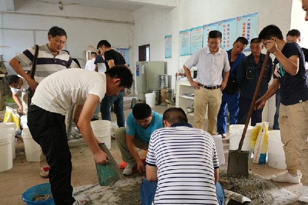 下午3時許,廖紹鋒副總經(jīng)理宣布比賽正式開始后,各隊人員迅速進入比賽場地,各隊入場后先確認所用原材料和設(shè)備、儀器、工具等是否符合現(xiàn)行國家標準要求,從原材料的稱量開始,到混凝土的手工拌合,對拌合混凝土的坍落度、擴展度、T500、倒筒時間等各項指標進行測試,到最后的試塊成型與場地的清理,各隊都井然有序的進行。在現(xiàn)場,水泥、摻合料、自來水、砂石、鐵鏟……這些都是參賽者們使用的原料和工具,沒有機器攪拌,完全靠人工拌合,各隊隊員汗流浹背,賽出了風格,賽出了水平,充分展現(xiàn)了良好的團隊協(xié)調(diào)能力、吃苦耐勞和奮斗拼搏的精神風貌。