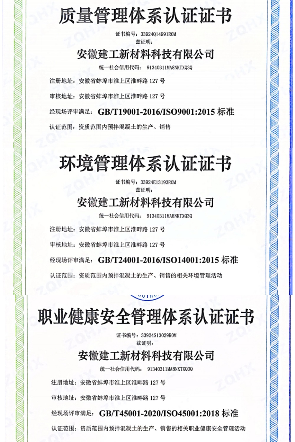2024年8月,安徽建工新材料科技有限公司成功獲得質(zhì)量管理體系(ISO9001)、環(huán)境管理體系(ISO14001)和職業(yè)健康安全管理體系(ISO45001)認證。三體系認證是國際標(biāo)準化組織(ISO)制定的標(biāo)準,此次認證表明公司在管理、質(zhì)量、環(huán)保及員工職業(yè)健康安全方面達到先進水平。