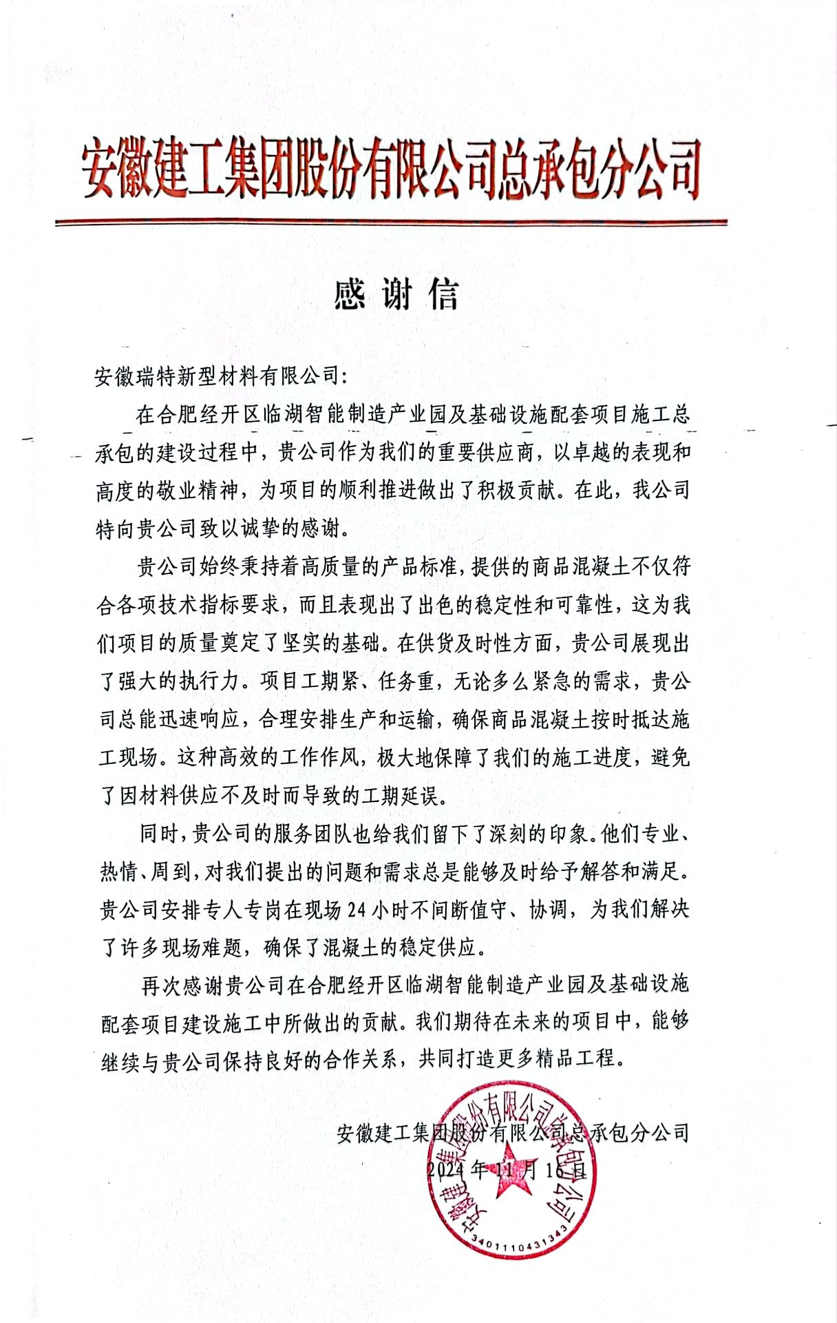 喜訊!安徽瑞特收到總承包大眾產(chǎn)業(yè)園項(xiàng)目感謝信