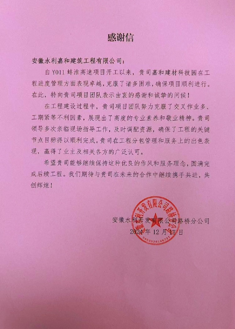 近期,嘉和建材科技園順利完成Y011蚌淮高速項(xiàng)目路面瀝青攤鋪施工主體任務(wù)。12月17日,嘉和建筑再次收到業(yè)主表揚(yáng)信,對(duì)Y011蚌淮高速項(xiàng)目施工進(jìn)度、施工質(zhì)量及項(xiàng)目團(tuán)隊(duì)表示充分肯定,對(duì)項(xiàng)目部在過程中展現(xiàn)出的良好工作作風(fēng)表示高度贊賞和肯定。