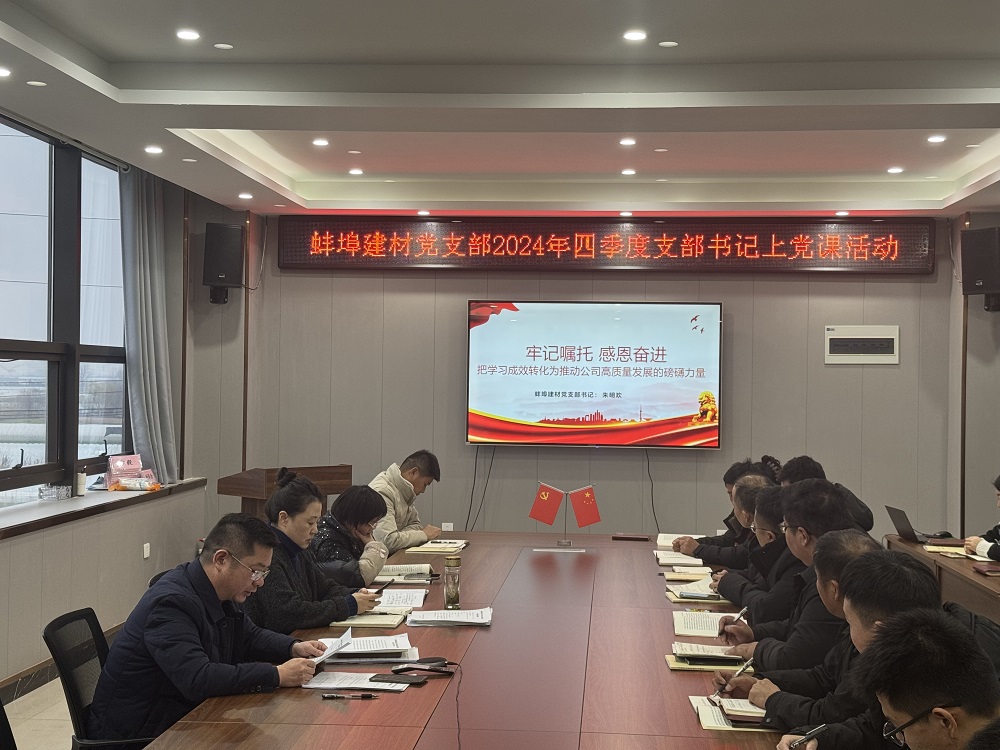 為進一步深入學習貫徹習近平總書記考察安徽重要講話精神,凝聚改革共識、激發(fā)奮進力量,提升支部凝聚力與戰(zhàn)斗力,引導黨員筑牢信仰之基、踐行初心使命、切實擔當作為。12月23日下午,蚌埠建材組織開展了四季度支部書記上黨課活動。公司黨支部書記、總經(jīng)理朱明歡以“牢記囑托,感恩奮進,將學習成效轉化為推動公司高質(zhì)量發(fā)展的磅礴力量”為主題,為全體黨員、積極分子、發(fā)展對象講授了一堂內(nèi)容詳實、形象生動的黨課。
