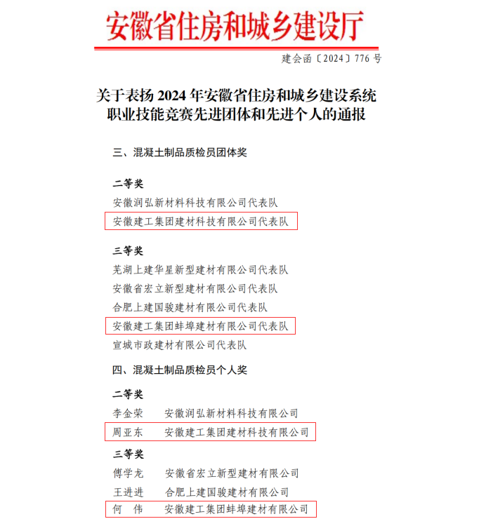 近日,由安徽省住房和城鄉(xiāng)建設(shè)廳主辦的2024年安徽省住房和城鄉(xiāng)建設(shè)系統(tǒng)職業(yè)技能競賽——混凝土制品質(zhì)檢員競賽成績公布。建工建材代表隊(duì)和建工蚌埠建材代表隊(duì)分別榮獲團(tuán)體獎二等獎和三等獎,周亞東、何偉分別獲得個人二等獎和三等獎。