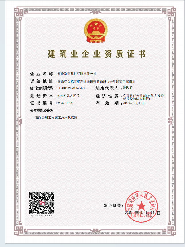 2025年1月15日,安徽新途建材有限責(zé)任公司喜獲安徽省住房和城鄉(xiāng)建設(shè)廳正式批準(zhǔn),市政公用工程施工總承包二級(jí)資質(zhì)順利通過(guò)審核。標(biāo)志著新途建材在市政公用工程領(lǐng)域邁上了新的臺(tái)階,市場(chǎng)競(jìng)爭(zhēng)力得到顯著提升,為公司的業(yè)務(wù)范圍拓展奠定了堅(jiān)實(shí)的基礎(chǔ)。