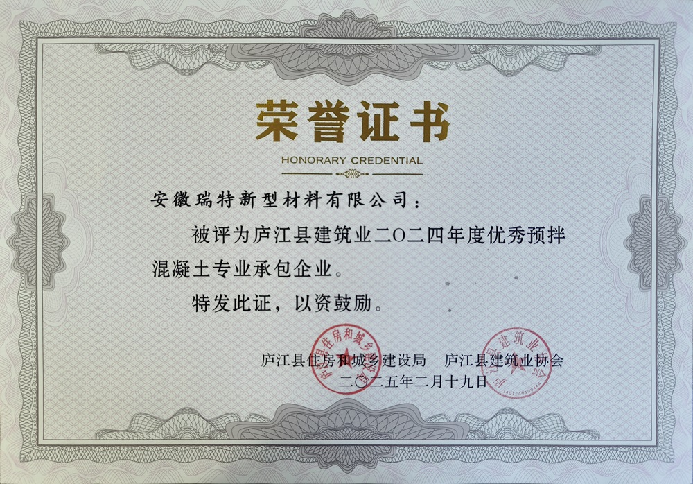安徽瑞特新型材料有限公司,憑借其在技術創(chuàng)新、綠色發(fā)展和社會責任等領域的卓越成就,再次榮獲“廬江縣建筑業(yè)2024年度優(yōu)秀預拌混凝土專業(yè)承包企業(yè)”殊榮。
