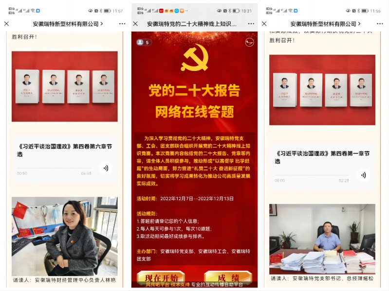 自黨的二十大會議召開以來,安徽瑞特黨支部迅速掀起學(xué)習(xí)熱潮,堅持系統(tǒng)謀劃,學(xué)用結(jié)合,廣泛組織各種學(xué)習(xí)宣貫活動,持續(xù)推動學(xué)習(xí)黨的二十大精神走深走實,讓黨的二十大精神入腦入心,切實將學(xué)習(xí)成果轉(zhuǎn)化為干事創(chuàng)業(yè)的生動實踐,助力安徽瑞特高質(zhì)量轉(zhuǎn)型升級。
