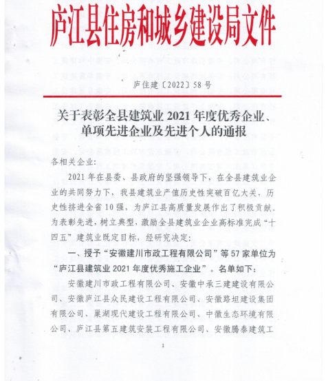 7月5日廬江縣住房和城鄉(xiāng)建設(shè)局公布廬住建【2022】58號(hào)文件《關(guān)于表彰全縣建筑業(yè)2021年度優(yōu)秀企業(yè)、單項(xiàng)先進(jìn)企業(yè)及先進(jìn)個(gè)人的通報(bào)》。在表彰中授予“安徽瑞特新型材料有限公司”等9家單位為“廬江縣建筑業(yè)2021年度優(yōu)秀預(yù)拌混凝土專業(yè)承包企業(yè)”。