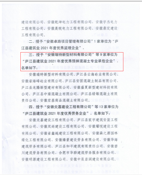 安徽瑞特榮獲2021年度廬江縣建筑業(yè)優(yōu)秀預(yù)拌混凝土專業(yè)承包企業(yè)