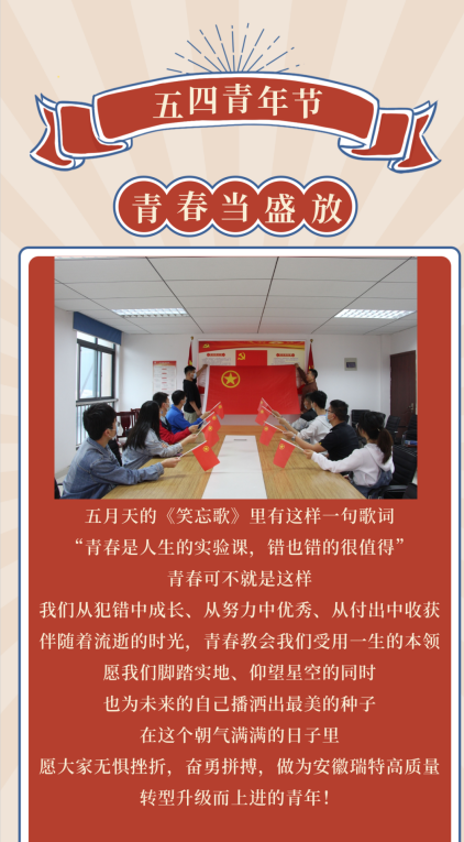 在五四青年節(jié)來臨之際,安徽瑞特團(tuán)支部組織觀看《電影黨課:五四精神》微視頻,點(diǎn)燃青年職工愛國熱情;通過召開五四青年職工在專題座談會(huì)面對面交流分享建團(tuán)百年心得感悟、重溫入團(tuán)誓詞、與團(tuán)旗合影,進(jìn)一步筑牢愛國、愛企情懷;在五四青年節(jié)當(dāng)天,團(tuán)支部發(fā)出五四青春寄語,引導(dǎo)青年職工將五四精神融入青年奮斗,譜寫新時(shí)代華章,為公司高質(zhì)量轉(zhuǎn)型升級貢獻(xiàn)青年力量。