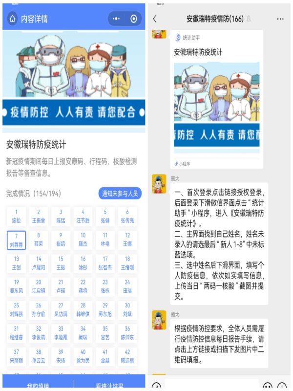 疫情就是命令,防控就是責(zé)任。安徽瑞特黨員干部和職工積極響應(yīng)黨組織號召,主動報名參加廠區(qū)疫情防控24小時值班工作,輪流奮戰(zhàn)在防控疫情的最前沿,逐人逐車檢查“雙碼”。同時嚴(yán)格落實屬地“三天一次核酸檢測”防疫政策,以實際行動助力疫情防控工作。通過召開安徽瑞特疫情防控生產(chǎn)協(xié)調(diào)會,分析研判疫情對生產(chǎn)經(jīng)營的影響,逐項制定保供保產(chǎn)措施預(yù)案。為進(jìn)一步加強(qiáng)防疫登記工作,探索“統(tǒng)計助手”微信小程序,實現(xiàn)全員線上填報員工每日健康信息,進(jìn)一步筑牢疫情防控安全防線。